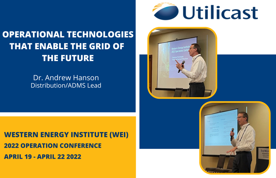 | Our Distribution and Advanced Distribution Management System (ADMS) Lead, Andrew Hanson, presented at Western Energy Institute (WEI)’s 2022 Operations Conference in Los Angeles, April 19-22. The conference enables discussions on operational leadership, workforce development, grid resilience, electric distribution, and grid of the future, among other topics. The session, Operational Technologies That Enable The Grid Of The Future, was co-presented by Andrew and one of our clients where we are System Integrator for their ADMS deployment. The session focused on ADMS as an operational technology, including DSCADA, DMS applications, and outage management system (OMS). He also shared the general challenges and benefits of Grid of the Future. Our client shared their specific ADMS characteristics and lessons learned. #UtilicastConsulting #UtilicastSolutions #ADMS |